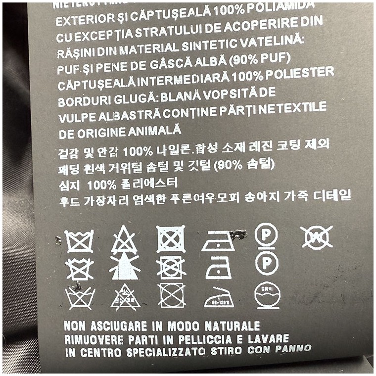 소재 : 겉감 및 안감 (나일론) / 충전재 (구스 솜털 90%, 깃털 10%) / 폭스 퍼