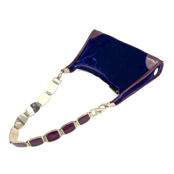 내용: 보라빛이 도는 고급스러운 벳벳소재와 깔끔한 페이던트의 조화가 멋스러운 숄더백으로 금장 큐빅 스트랩이 고급스러움을 강조합니다.